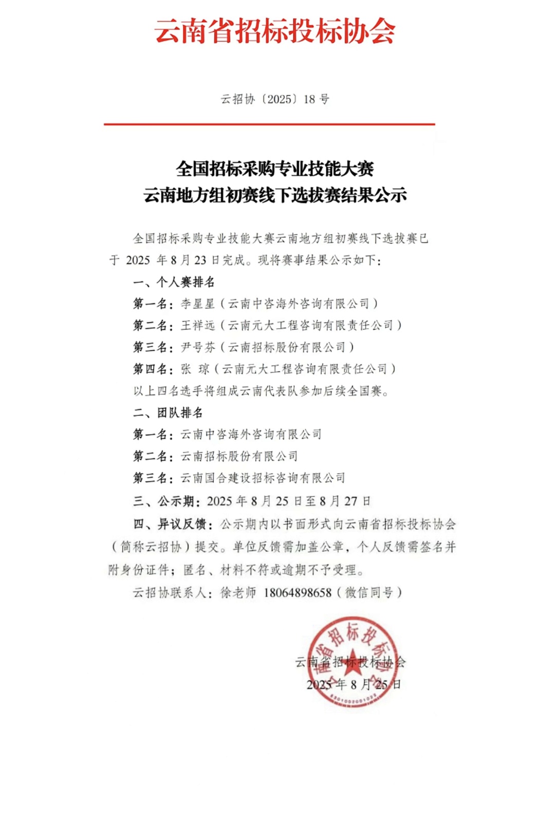 喜報?? 全國招標采購專業(yè)技能大賽云南地方組初賽結(jié)果出爐,我司團隊賽第一 + 個人賽第一 ,雙冠加冕!