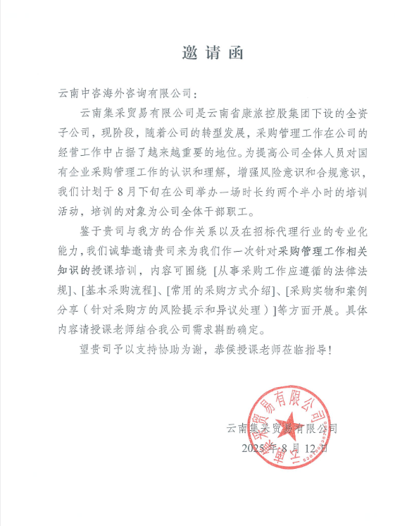 云南中咨海外咨詢有限公司憑借二十余年招標采購領(lǐng)域?qū)I(yè)積淀與豐富實踐經(jīng)驗,獲長期合作伙伴 —— 云南集采貿(mào)易有限公司(云南省康旅控股集團全資子公司)信賴,受邀為其開展采購管理專題培訓,助力其轉(zhuǎn)型發(fā)展中采購管理體系規(guī)范化建設 。